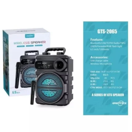 يُظهر المنتج في الصورة مكبر صوت بلوتوث لاسلكي GREATNICE GTS-1941 ويأتي مع ميكروفون لاسلكي.